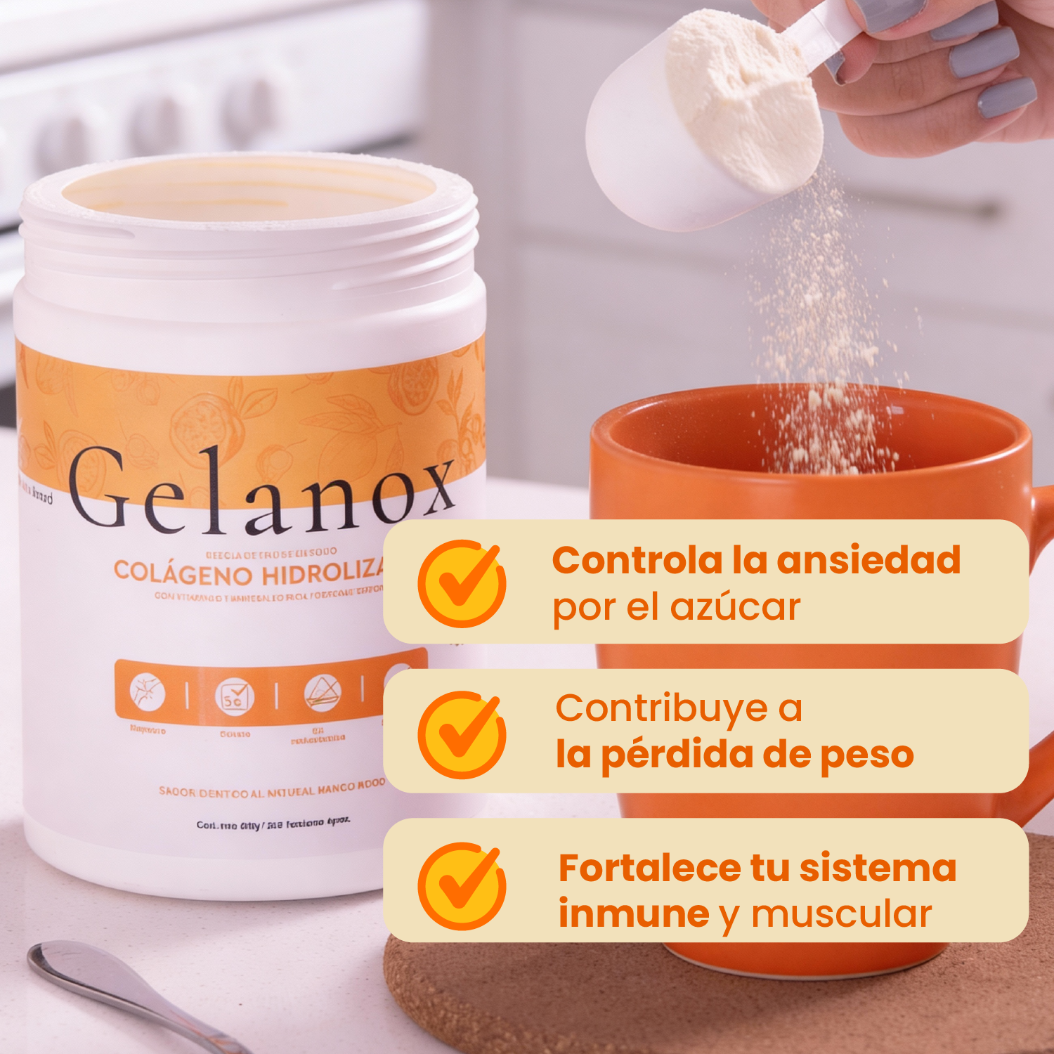 La producción natural de colágeno disminuye aproximadamente 1-2% anual a partir de los 25 años. Gelanox fue diseñado para contrarrestar ese proceso: colágeno hidrolizado de alta biodisponibilidad que llega directamente a piel, cabello, articulaciones y tejido conectivo. El diferencial frente al mercado es claro: sabor tropical delicioso, fórmula enriquecida y origen colombiano. 0 g de azúcares añadidas.