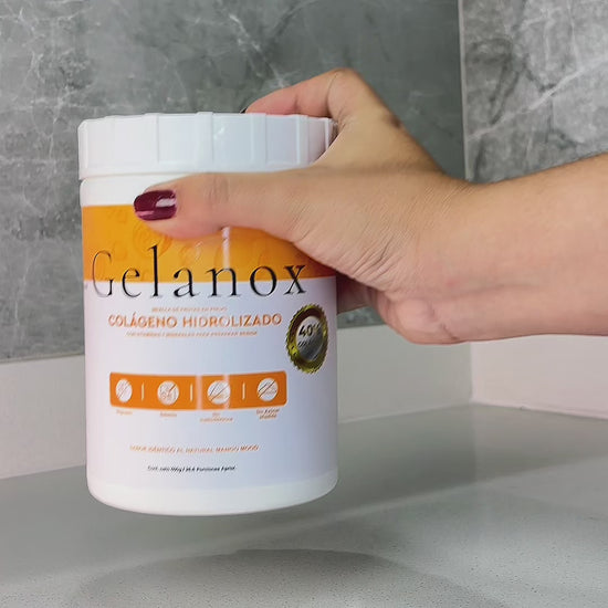Gelanox es el Colágeno Hidrolizado de NutraBrand: un alimento funcional en polvo elaborado con una base tropical de mango dorado, maracuyá y uchuva — tres frutas colombianas ricas en vitamina C, betacarotenos y polifenoles que potencian la síntesis y absorción del colágeno. Además, está enriquecido con magnesio, Selenio, vitamina C y enzimas digestivas naturales. 40% de Colágeno y con Nativanox