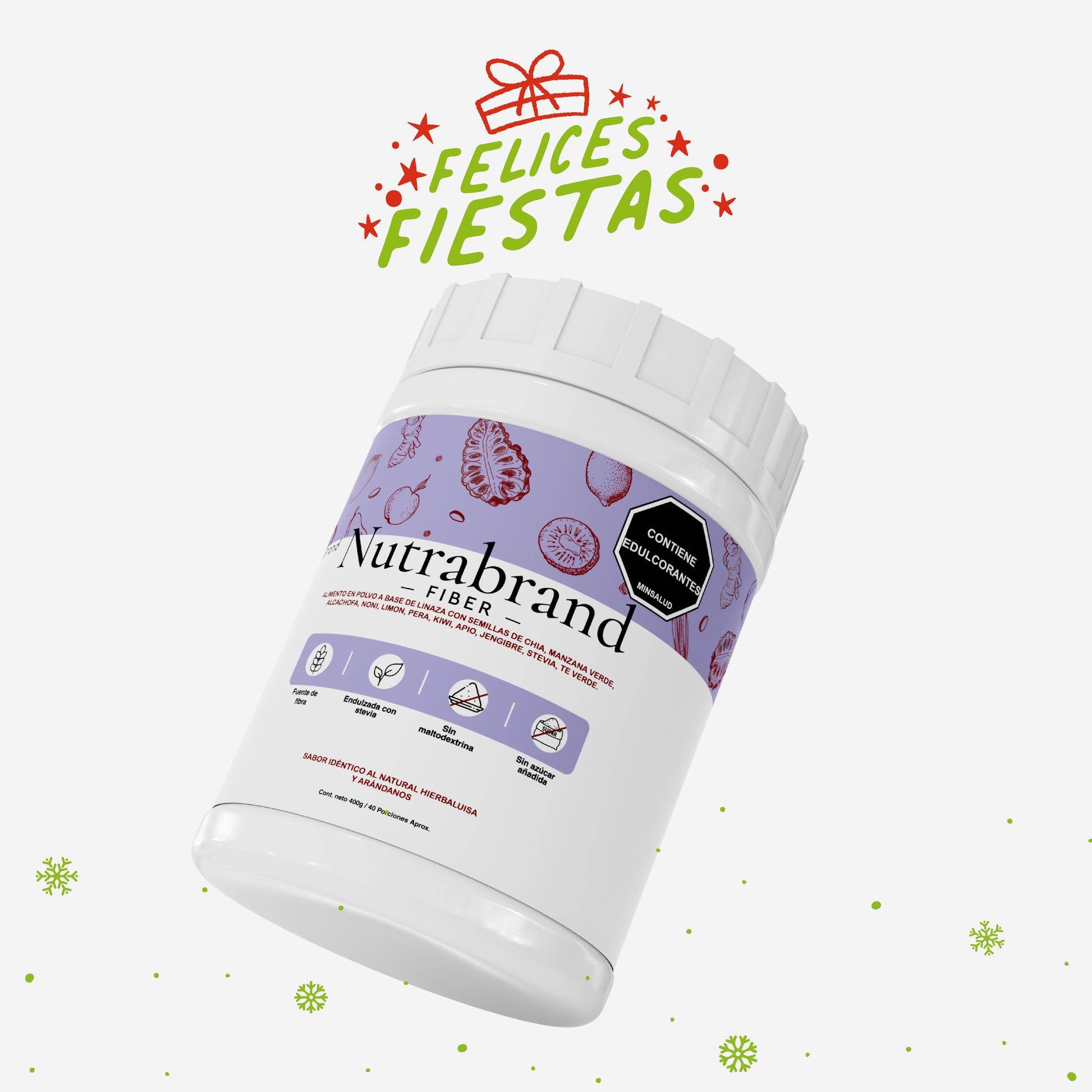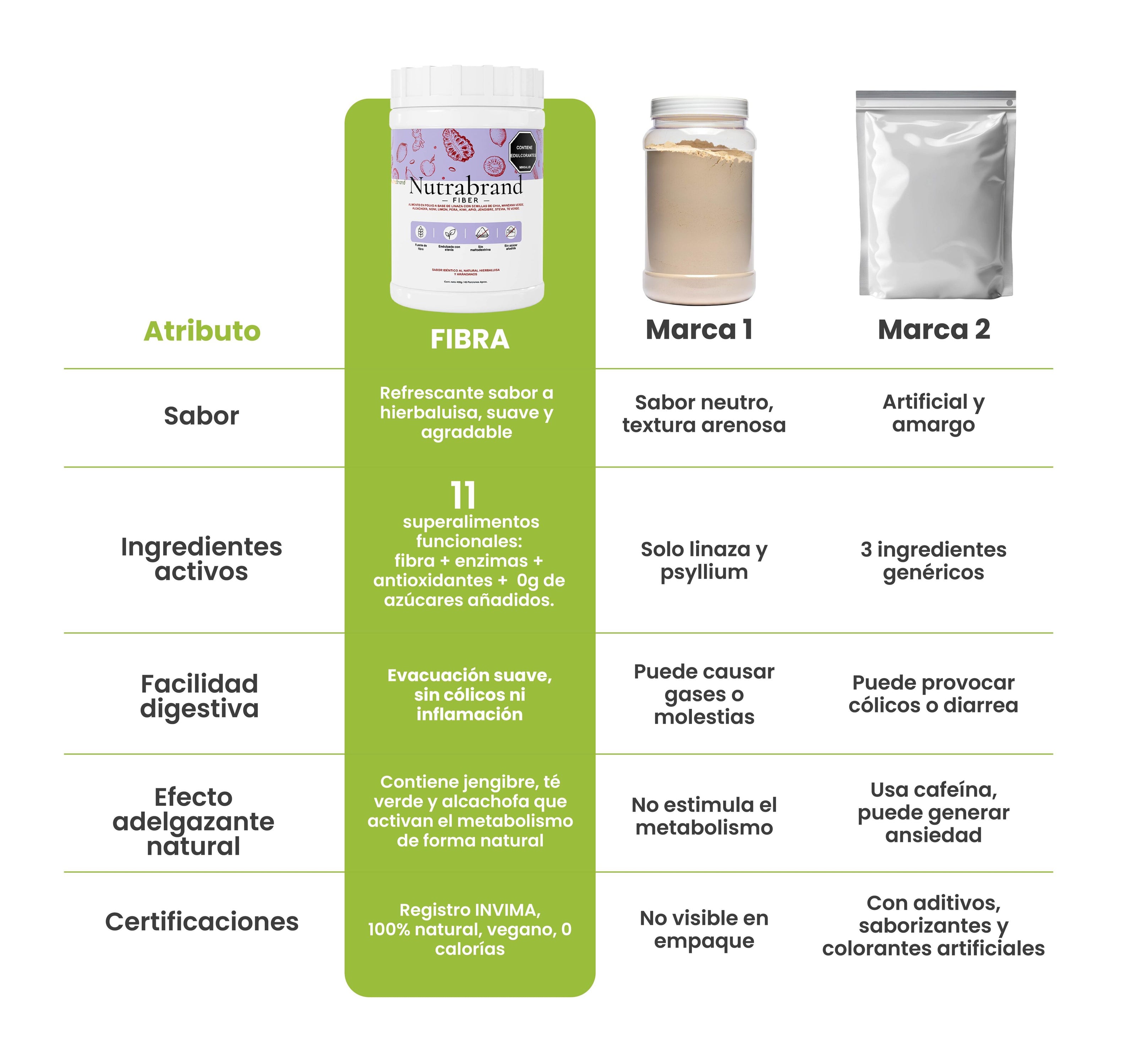 Nutrabrand Fiber es un alimento funcional formulado a partir de una combinación de fibras naturales como linaza con semillas de chía, manzana verde, alcachofa, noni, limón, kiwi, apio, pera, té verde, entre otros. Su aporte de fibra ayuda a alcanzar la ingesta recomendada en una alimentación balanceada.