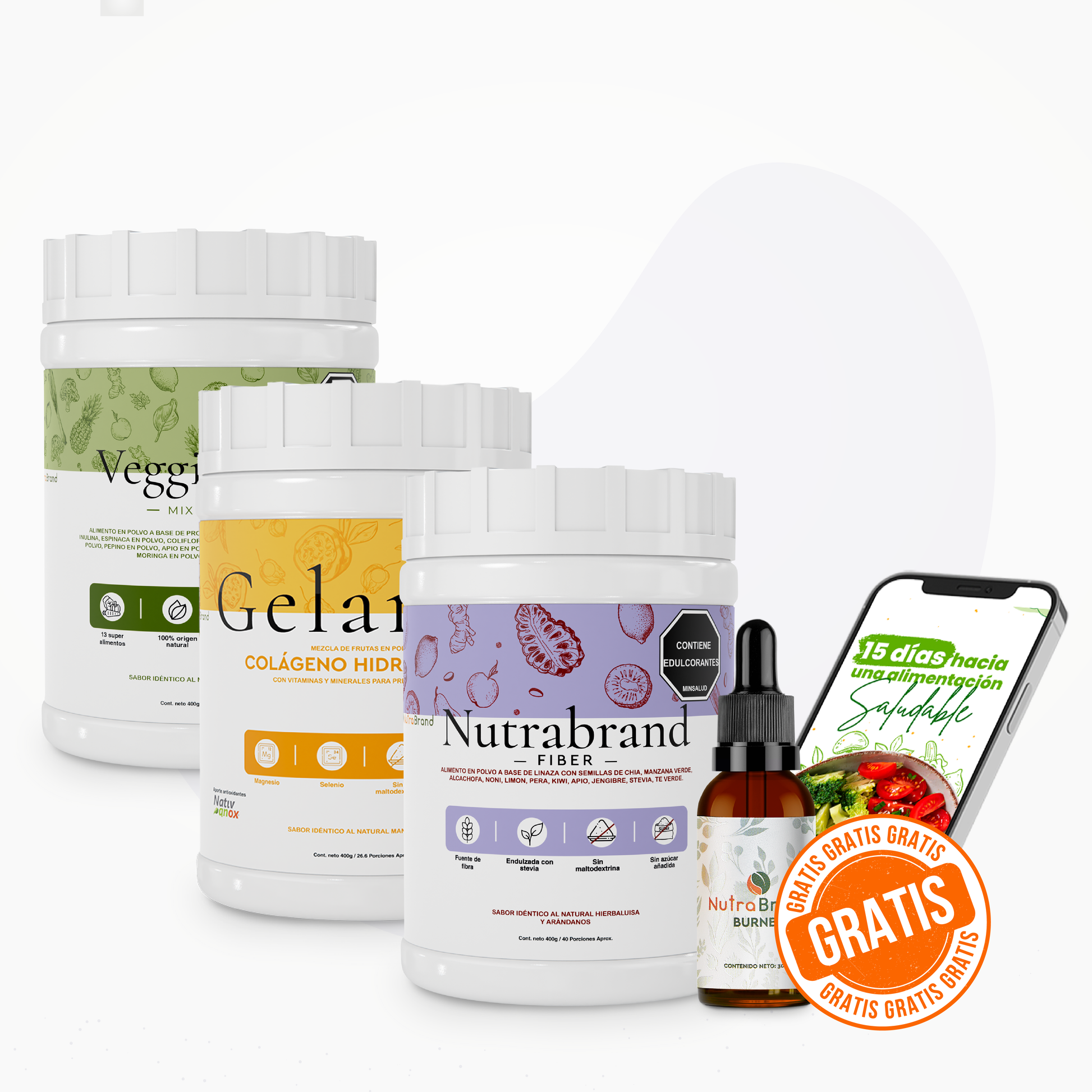 El Combo Saludable de NutraBrand es la fórmula más completa de la línea: reúne el Jugo Verde Veggie Mix para energía y nutrición vegetal diaria, la Fibra Natural para regular la digestión y el metabolismo, y el Colágeno Hidrolizado Gelanox para regenerar piel, cabello, articulaciones y tejido conectivo. Tres productos que actúan en sinergia para transformar tu bienestar de forma integral.